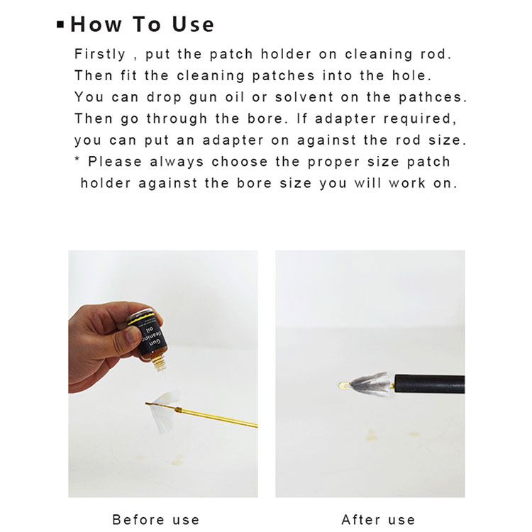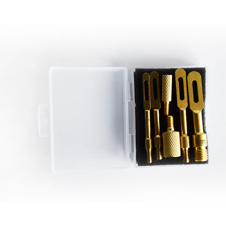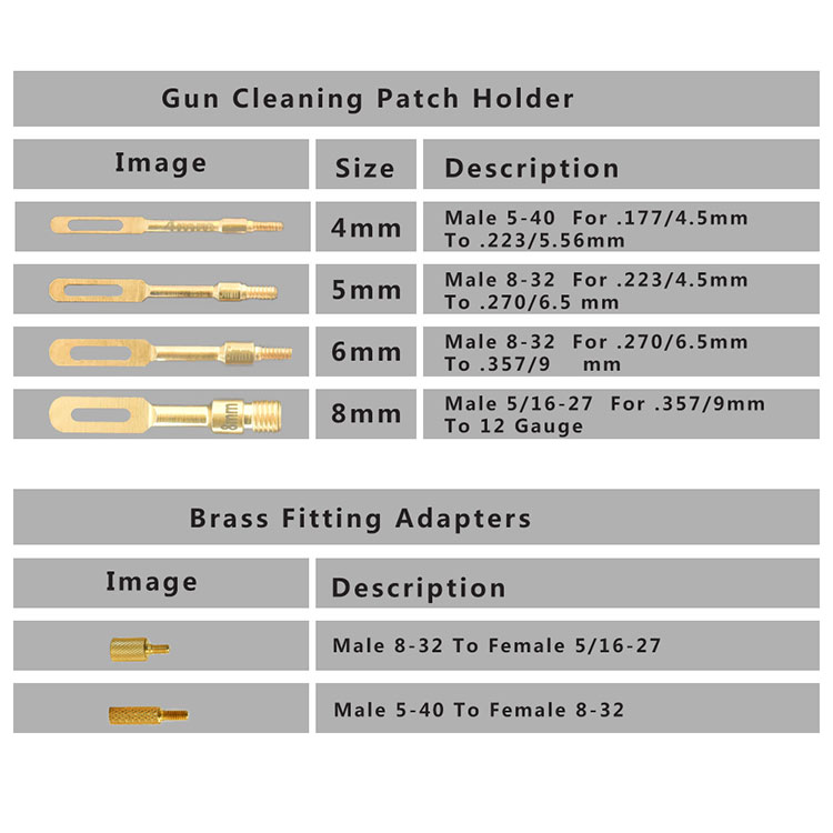 ● Holdere/spisser for pistolrengjøring med 4 størrelser kan møte kaliber fra .177cal./4.5mm til 12 Gauge, passer for rifler, håndvåpen, hagler.