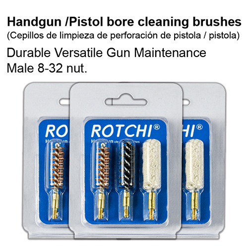 Håndvåpenboringsbørste 3-i-1 sett, blister og kort pakke. Tilgjengelige størrelser: .22, 9mm, .40, .45cal.