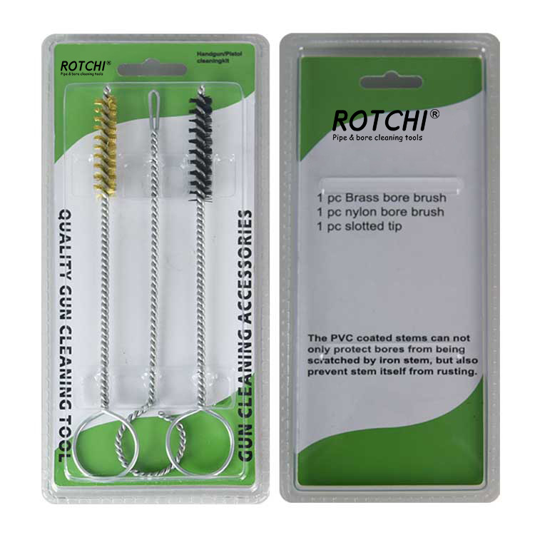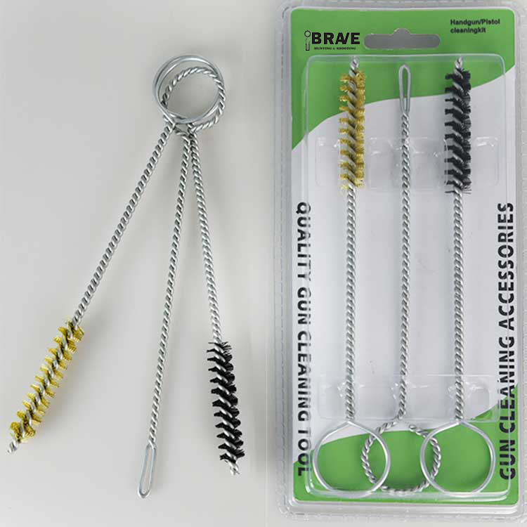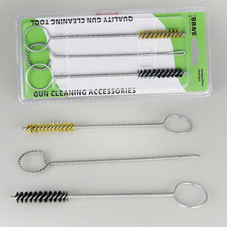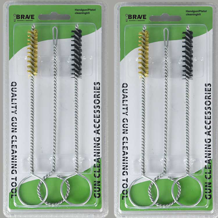3 stk vaskesett for håndvåpen, pakket i dobbel blisterpakning. En rensebørste i messing, en rensebørste i nylon og en lappholder med slisse. Hendig og effektiv.