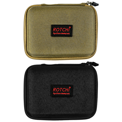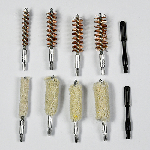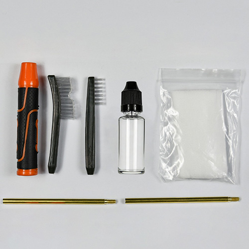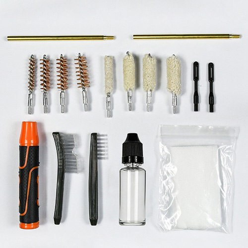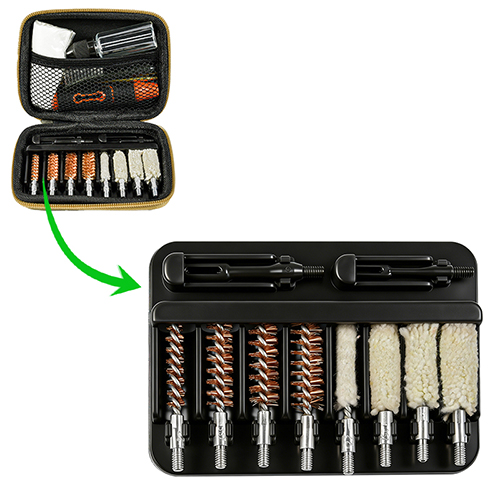 Håndvåpenrensesett inkluderer 4 størrelser (.22, 9mm, .40, .45cal.). OX klut belagt PVC-etui med glidelås. Messingbørster og bomullsmopper, 2 stenger. Sand og svart farge for valg.