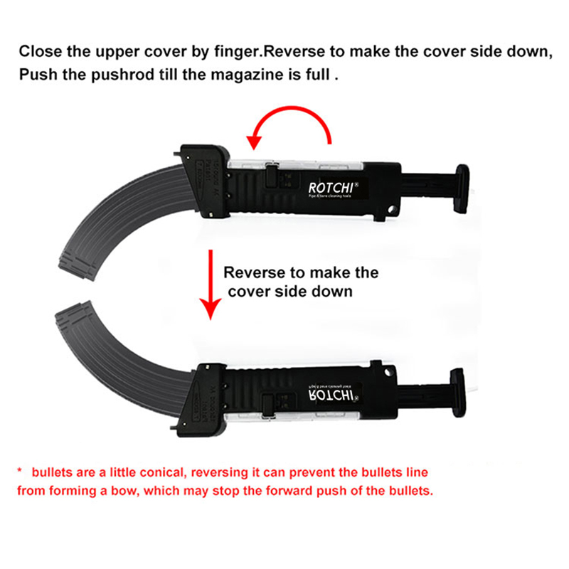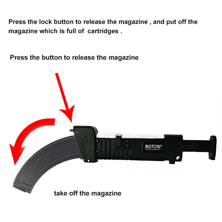 Magasin Speed Loader for AK47 ● Brukes til å laste 7,62X39 mm patroner inn i AK-magasin med kapasitet 10/20/30 eller mer større. ● Fyll patronene fulle i sporet, installer magasinet på samme AK-mekaniske prinsipp. trykk på skyveren, patronene kommer lett inn i magasinet. ● Enkel betjening, en jente kan gjøre veldig fort. ● Sterk kropp. Du kan se patronene inne i lasteren gjennom det rene dekselet. En lås kontrollerer at dekselet ikke åpnes under lagring. ● Den kan også ta ut kassettene fra magasinet når du ikke vil fotografere, men magasinet fortsatt er fullt.