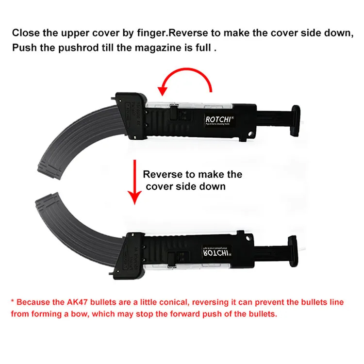 ● Brukes til å laste 7,62X39 mm patroner inn i AK-magasin med kapasitet 10/20/30 eller mer større.