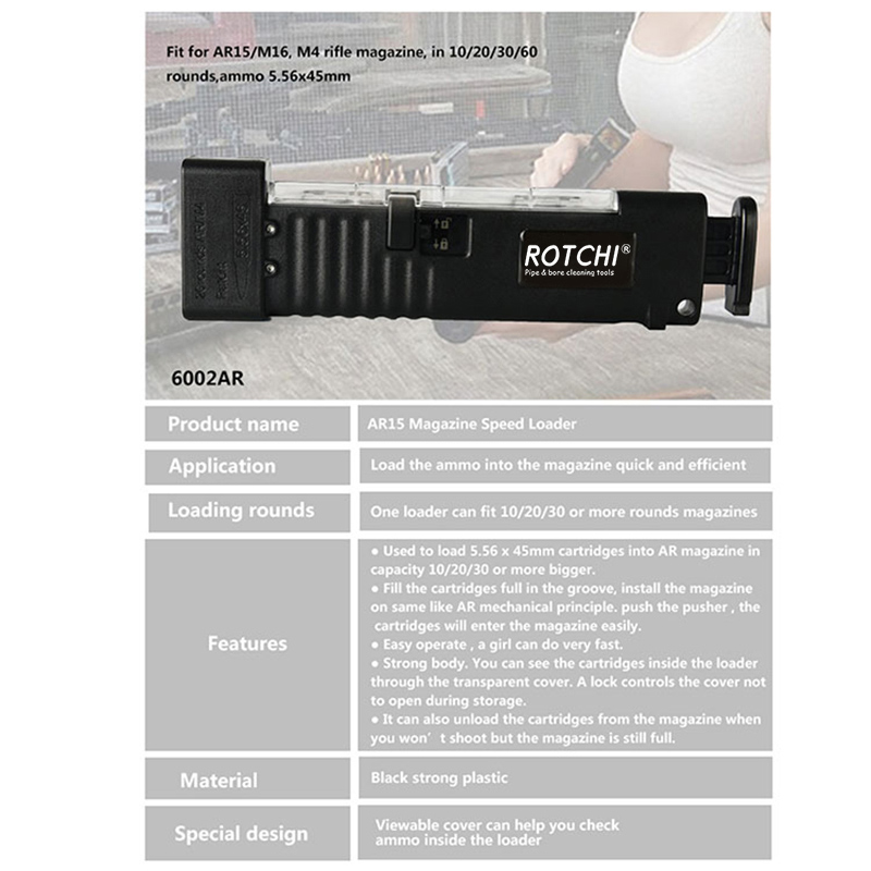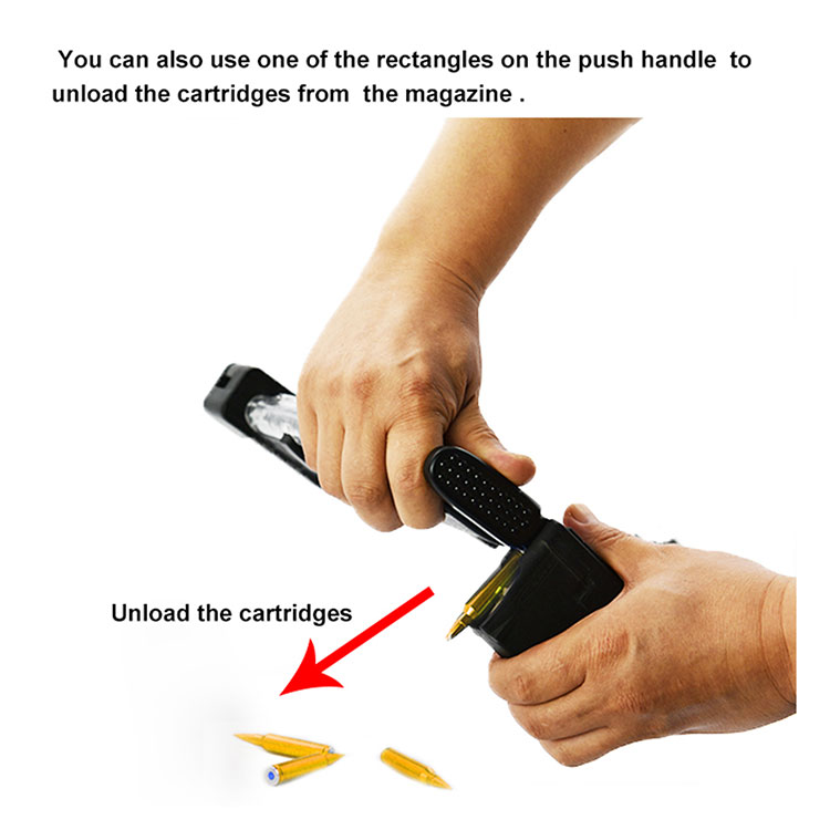 Magazine Speed Loader for AR15 ● Brukes til å laste 5,56 x 45 mm kassetter i AR-magasin med kapasitet 10/20/30 eller mer større. ● Fyll patronene fulle i sporet, installer magasinet på samme som AR mekaniske prinsipp. trykk på skyveren, patronene kommer lett inn i magasinet. ● Enkel betjening, en jente kan gjøre veldig fort. ● Sterk kropp. Du kan se patronene inne i lasteren gjennom det gjennomsiktige dekselet. En lås kontrollerer at dekselet ikke åpnes under lagring. ● Den kan også ta ut kassettene fra magasinet når du ikke vil fotografere, men magasinet fortsatt er fullt.
