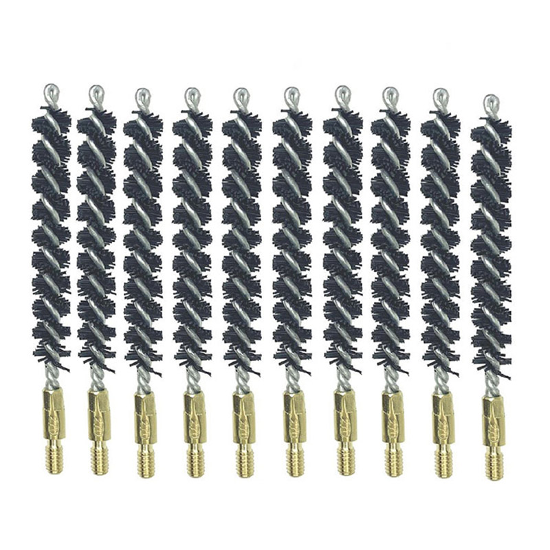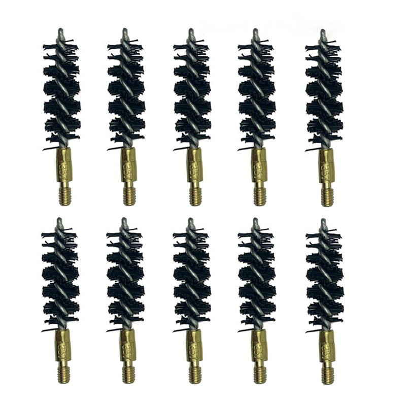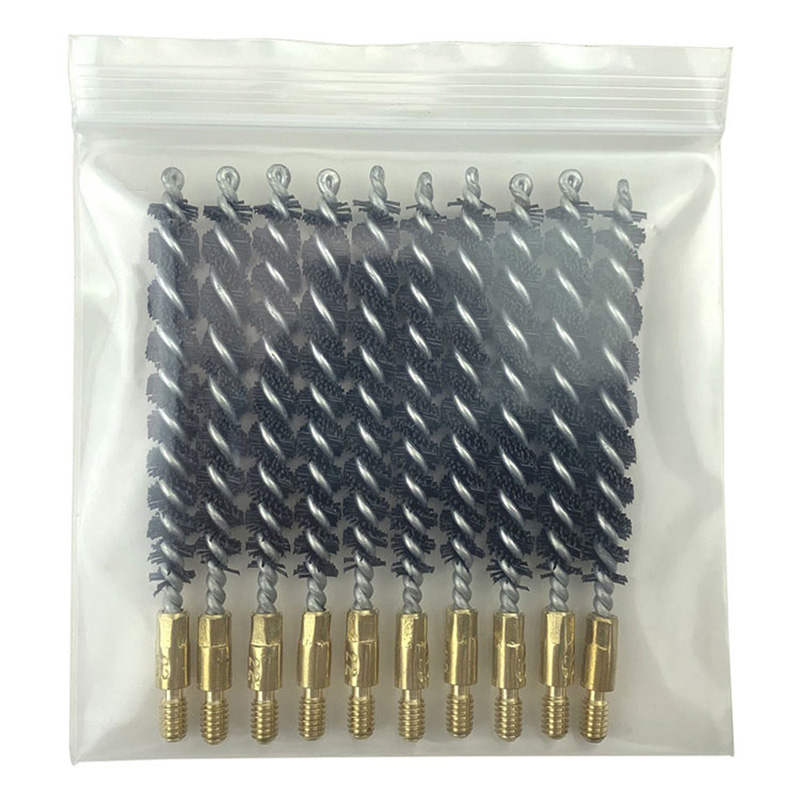Nylontråder Pistolrengjøringsbørster for boring ● Kraftige nylontråder. Rustfri stålstamme. ● Hver børstediameter vil være 0,5-3 mm større enn den tilsvarende innvendige diameteren, slik at den kan rengjøre boringen grundig. ● Hver børste med kalibernummeret trykket på børsten er ikke tydelig. ● Mutteren presses stramt og sterkt på børstestammen. ● OEM og kundelogo akseptert.