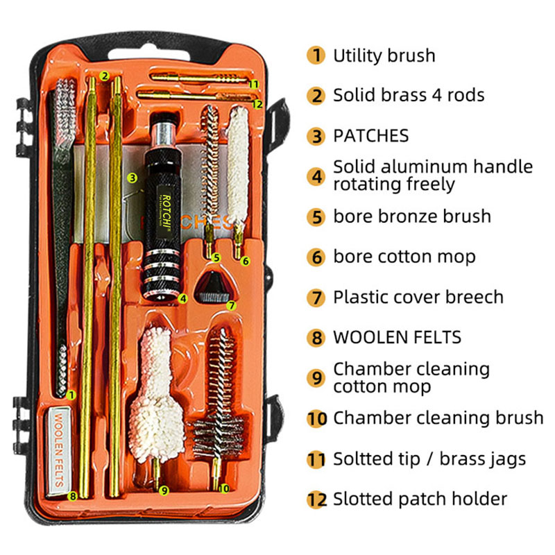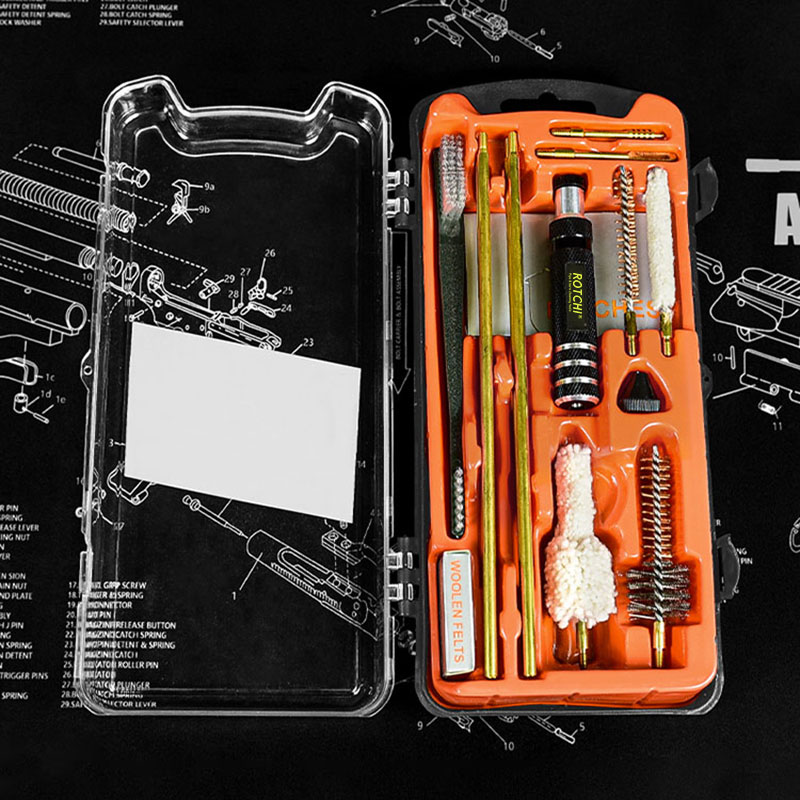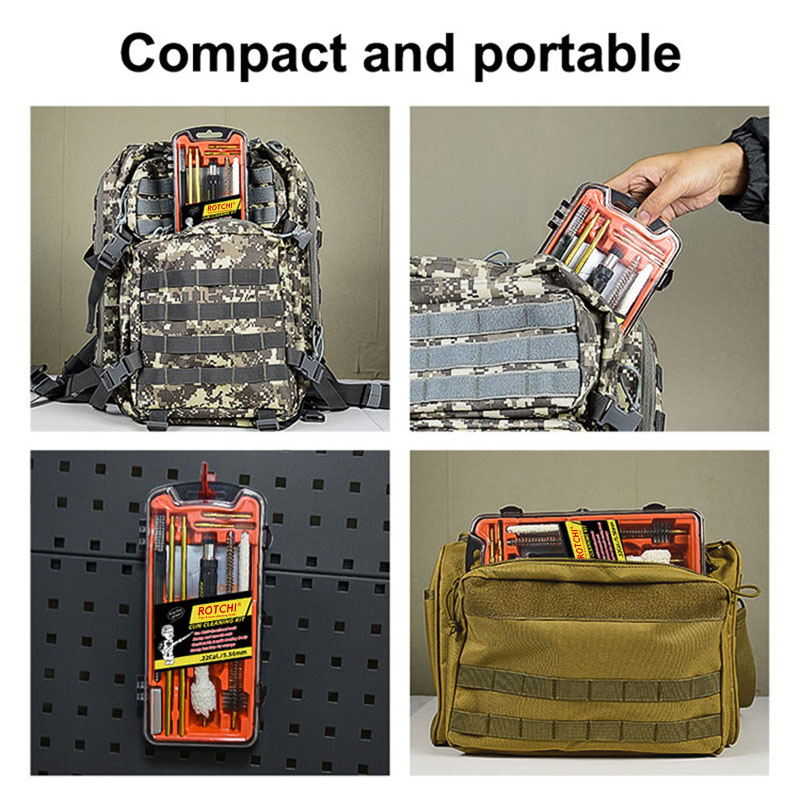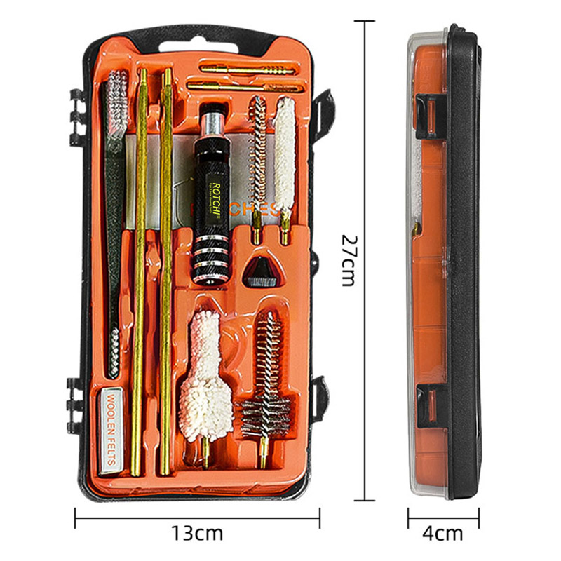 Riffelsettet for utendørs våpenrengjøring gir deg alle de profesjonelle rengjøringsverktøyene for å møte forskjellige pistolkalibre. Blisterbrett hjelper deg å samle dem regelmessig. Det lille volumet og den sterke kofferten kan tillate deg å legge dem i våpenvesker eller sekker. Seriene er uten oljeflaske i.