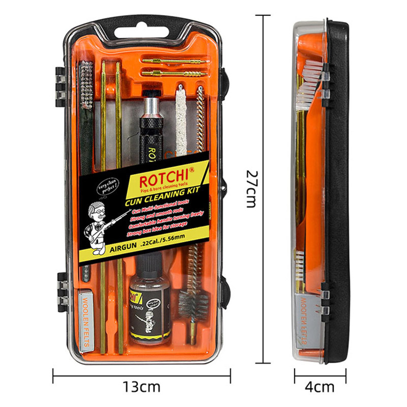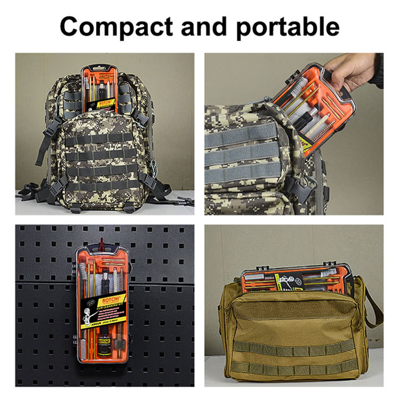 Riflerensesettet med oransje kasseoljeflaske gir deg alle de profesjonelle rengjøringsverktøyene for å møte forskjellige pistolkalibre. Blisterbrett hjelper deg å samle dem regelmessig. Det lille volumet og den sterke kofferten kan tillate deg å legge dem i våpenvesker eller sekker. Seriene er uten oljeflaske i.